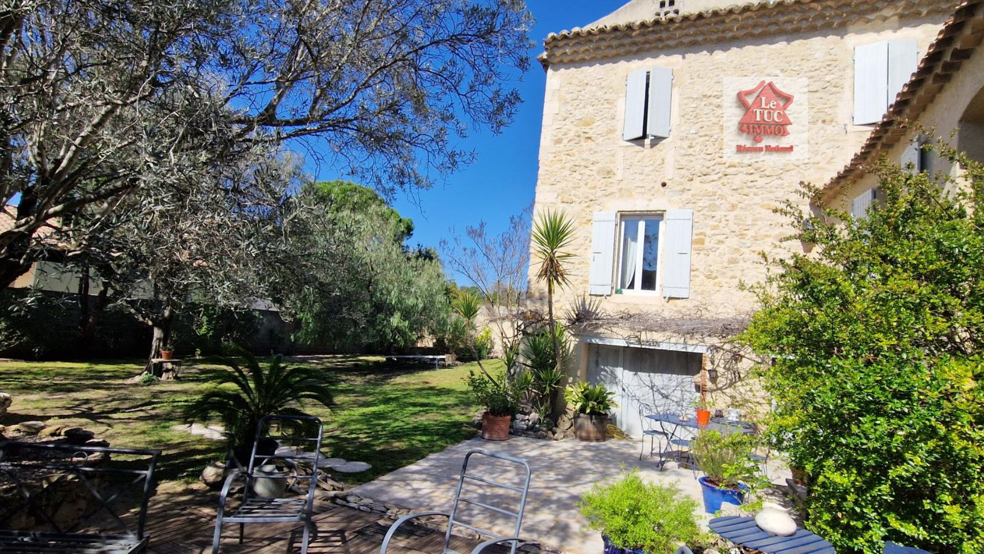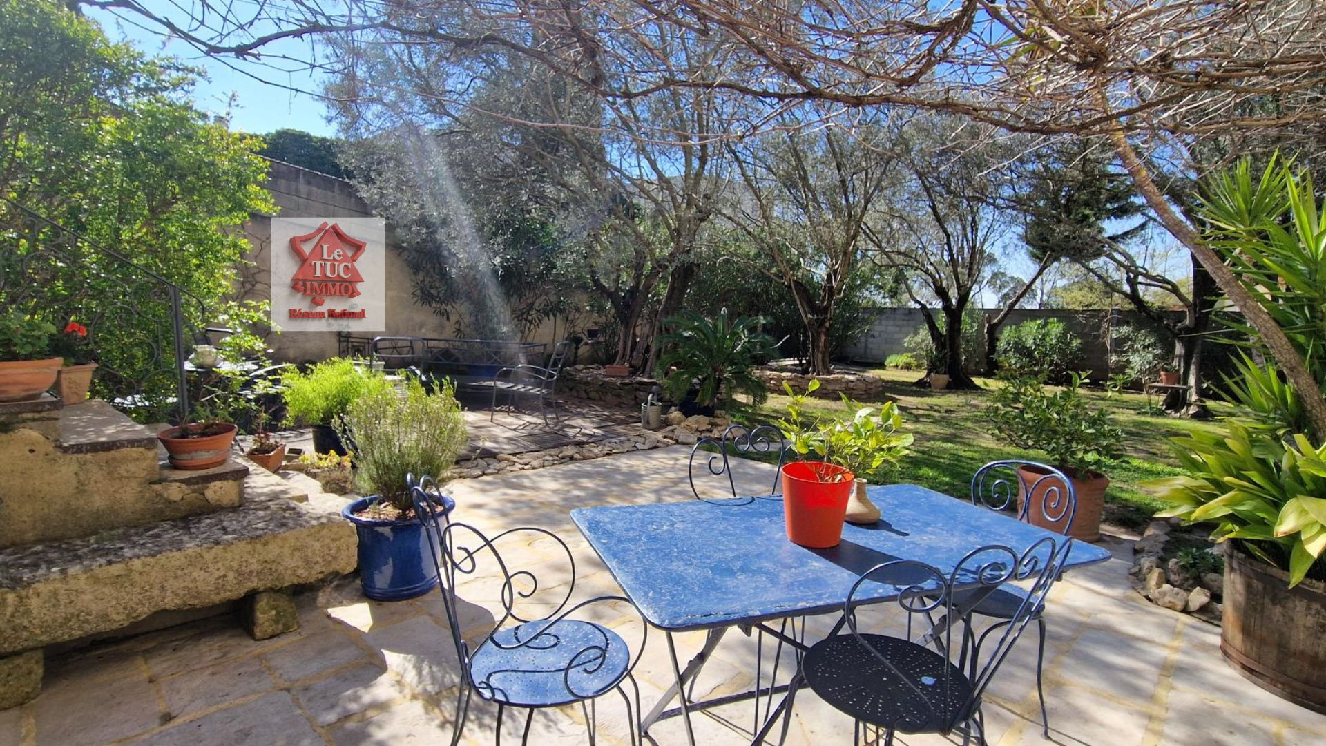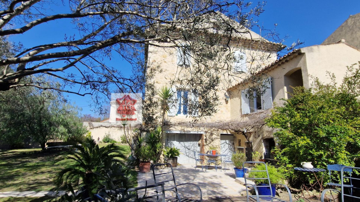 Cette bâtisse de caractère est implantée sur un terrain de 567 m² joliment arboré, véritable écrin de verdure agrémenté de magnifiques oliviers centenaires.